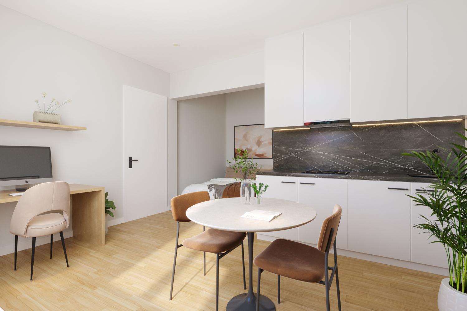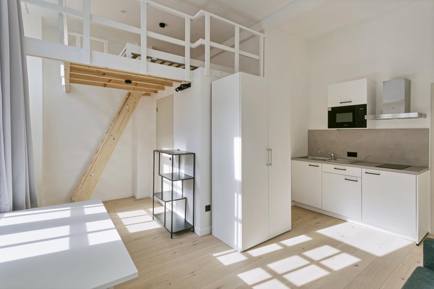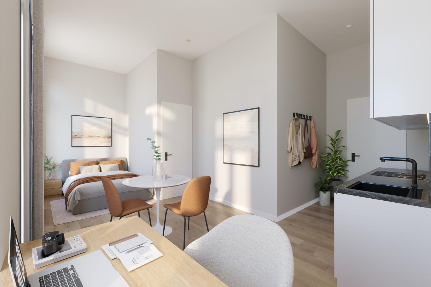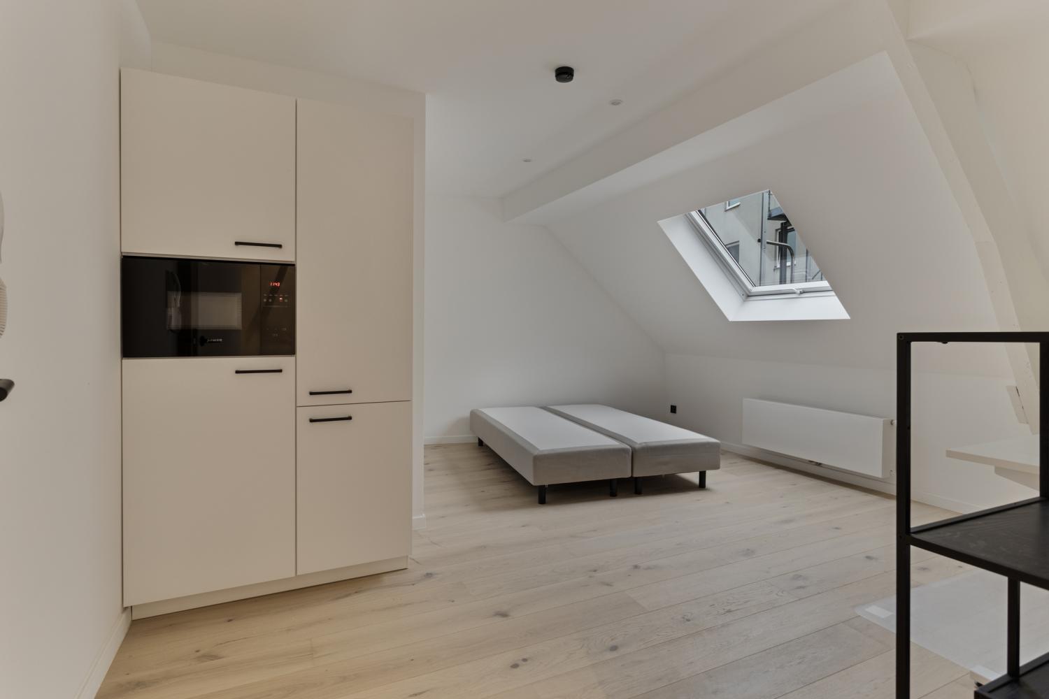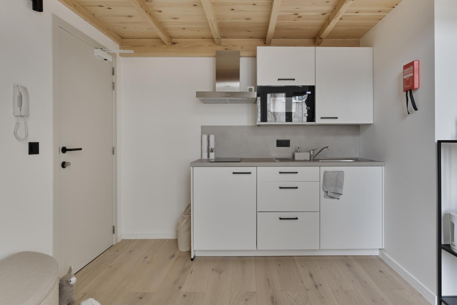 Elke kamer/studio wordt uitgerust met een vaste kast met microgolf en frigo of een kitchenette. Ook losse meubels zoals bed, bureau en kast worden door ons voorzien.